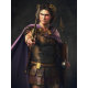 "Alexandre le Grand" - Conquérant des Empires. Une représentation stylisée d'Alexandre le Grand. Un jeune homme d'une vingtaine d'années, aux yeux bleus percevants, se tenant en confiance. Il a de longs cheveux brun clair ou blond foncé, ondulés. Il porte une cuirasse de bronze finement ouvragée (plaque d'estampille) ornée de gravures complexes, éventuellement avec des scènes mythologiques ou des symboles de sa divinité. Au-dessus de ses épaules, il porte un manteau mauve court et coulant (chlamys) fixé à l'épaule droite par une broche en or, symbolisant le pourcentage. Il tient un hoplon (bouclier) et une lance dans une main et une représentation stylisée de son Kopis (épée) dans l'autre. Une couronne d'or entoure sa tête, symbolisant sa prétention à l'ascendance divine.