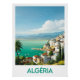 Bright illustration of Algeria showing a typical coastal town overlooking turquoise waters, with red rooftops, palm trees and mountains in the background. A perfect poster for Mediterranean-inspired wall decoration.
