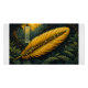 Un concept-art et une illustration éditoriale audacieux de style boisé, avec une magnifique plume dorée surdimensionnée et de fortes lignes graphiques définissant ses barbes. La plume repose sur un feuillage de fougères vert foncé stylisé et est décorée d'incrustations de bijoux finement sculptés - diamants et perles - qui attrapent la lumière stylisée, dépeint à travers des formes propres et des tons contrastés caractéristiques de l'art de la coupe de bois. L'arrière - plan présente une cascade simplifiée, ensoleillée et une scène forestière éthérée, rendue avec contraste élevé, zones de couleurs solides et textures. En utilisant une palette de couleurs chaudes limitée de jaunes dorés, de verts profonds, de bruns riches et de contours noirs crus, la pièce évoque des thèmes de magie ancienne, une relique d'imaginaire perdu, ou un précieux artefact d'une civilisation futuriste et intégrée à la nature. La composition globale est de haute qualité, émotionnellement évocatrice, mêlant esthétique de l'imaginaire de science-fiction avec un charme intemporel et mystique.