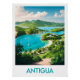 Paradise-style illustration of Antigua showing a turquoise bay lined with beaches, palm trees and sailboats, with green hills in the background. A perfect poster for sunny and tropical wall decor.
