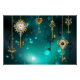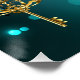 Gold, antique keys with gears and dials hang on gold chains on luminous green background.
