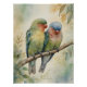 Cette charmante aquarelle présente une paire de lovebirds perchés sur une branche d'eucalyptus, entourés de feuilles verts doux. Les touches délicates et les couleurs harmonieuses créent une scène nature romantique et sereine, parfaite pour les amateurs d'oiseaux et d'art botanique.