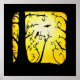 Un arrière - plan à dégradé jaune vif. Les arbres tourbillonnant silhoués s'approchent de la lumière centrale. Un oiseau est assis sur une flèche tandis qu'un autre s'envole à proximité tout en rétroéclairé par des jaunes clairs. Ceci est une copie de mon tableau original.