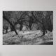 Des arbres sombres encadrent un pré d'herbe. Noir et blanc.