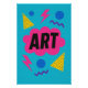 Ici, "art" explose en formes débridées et en couleurs acidulées. L’affiche est une composition électrique : un grand mot "ART" en typo bold, tordu et exagéré, flotte au centre sur un fond turquoise vif. Autour, des éclairs roses fluo, des triangles jaunes à pois noirs, des cercles bleus vibrants et des zigzags violets créent une atmosphère festive et surréaliste.