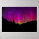 Un magnifique paysage nocturne. Les montagnes et les arbres apparaissent comme une silhouette noire contre un affichage lumineux et vif des aurores boréales scintillant au-dessus. Ce ciel nocturne excitant brille de rose, de violet et de jaune.