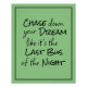 "Descendez votre Rêve comme si c'était le Dernier Bus de la Nuit" est une expression de motivation à afficher sur votre mur. Lettres et bordures noires. Arrière - plan vert mousse.