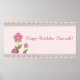 Bannière de fête d'anniversaire avec des coccinelles roses et des fleurs. La taille indiquée est de 12"x24".