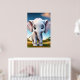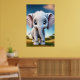Poster d'un petit éléphant mignon et animé aux grands yeux expressifs, debout dans un champ herbacé sous un ciel lumineux. L'éléphant a une expression joyeuse, ornée de couleurs douces et pastel qui rehaussent sa nature ludique.