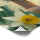 Une belle fée aux cheveux bleus aux ailes jaune pâle portant une jolie robe couleur aqua et un collier d'aquamarine tient une seule jonquille debout dans un champ de jonquilles.