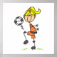 A blond haired girl stick figure soccer player in orange uniform bounces the soccer ball with her knee on soccer player T-shirts, hoodies, mugs, magnets, cards, stickers, bags, morts, keepsakes, pillows, and other soccer apparel and toxits.