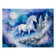 Une gracieuse licorne blanche se dresse devant un ancien château, baigné de lumière lune et entouré de brume. OEuvre d'aquarelle en bois enchantée, pleine de charme de conte de fées.