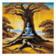 L'interprétation d'un Bouddha serein créée par l'I.A. est représentée méditant sous un grand arbre aux racines et branches étendues. Les teintes dorées dominent le paysage surréaliste, avec en toile de fond montagneux et un cadre ou soleil levant derrière le Bouddha.