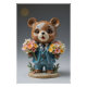 Une charmante figurine en céramique d'un ourson anthropomorphe dans un style fantaisiste, d'inspiration chibi. L'ours porte un costume bleu vitré, une chemise blanche et une cravate foncée à motifs, avec une fourrure en céramique brun brillant et de grands yeux expressifs qui expriment une douce émerveillement. Il se tient debout, tenant deux bouquets de fleurs en céramique colorés en rose, jaune et blanc. La figurine repose sur un sobre socle en céramique avec de délicats effets peints - un soleil et un ciel doux comme de l'aquarelle, et de minuscules fleurs poussent à ses pieds. Fini avec des glaçures lisses et douces, la pièce dégage chaleur, innocence et joyeux attrait artisanal.