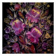 Un tableau vibrant de fleurs lilas sur un arrière - plan sombre dans le style traditionnel Petrykivka. La composition présente des motifs floraux complexes, avec des touches délicates et profondes qui créent un sens du mouvement et de l'élégance. Les fleurs sont entourées de feuilles ornés et de petits détails décoratifs dans les tons verts, jaunes et blancs, contrastant magnifiquement avec le fond sombre.