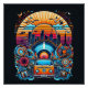 Un design animé présente une fourgonnette rétro entourée d'éléments musicaux et de fleurs, située sur un paysage urbain avec un lever de soleil coloré. La composition comprend des oiseaux, des instruments et des motifs célestes, créant une sensation psychédélique et énergique.