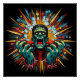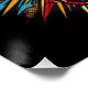 Une représentation vibrante d'un monstre à la bouche ouverte et aux mains levées est dressée contre un éclat explosif de rayures et de points colorés. La composition dynamique transmet l'excitation et l'énergie.