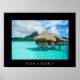 Affiche d'un bungalow en lune de miel au toit de chaume au-dessus de l'eau dans un resort dans la lagune turquoise et limpide de l'île tropicale Bora Bora avec vue sur le mont Otemanu près de Tahiti en Polynésie française avec une frontière noire et le texte : 'Bora Bora'. Superbe décoration sur votre mur !