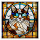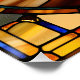 Un chat calico portant des lunettes de soleil est représenté en vitrail.