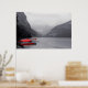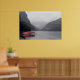 Un superbe tirage en noir et blanc avec des couleurs sélectives sur des pirogues rouges sur les eaux de Lake Louise, Alberta, Canada. Le mont Victoria est obscurci par le brouillard et les nuages bas.