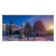 Coucher de soleil couvert de neige Carré de l'hôtel de ville de Riga en hiver à Riga, Lettonie. Vue de la célèbre Maison des Têtes Noires et de la Statue de Roland contre le ciel bleu avec les lumières du coucher de soleil