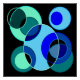 Motif abstrait coloré et géométrique, différentes nuances de vert et bleu intersectent cercles sur arrière - plan noir