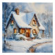 Un cottage confortable et enneigé avec des fenêtres brillantes, une cheminée fumante et une couronne festive à la porte, entouré d'arbres nus et de neige fraîche. La scène hivernale sereine évoque chaleur et solitude, parfaite pour les oeuvres d'art cartes de fin de année ou saisonnières.