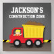 Un décor mural coloré pour la chambre d'un garçon ou une nurserie ! Il présente un petit garçon ouvrier mignon avec un casque de sécurité et un gilet orange conduisant un camion à benne rouge. Le design est traité avec un effet d'ombre qui le fait ressortir. Un motif de bandes jaunes et noires inclinées à l'arrière-plan, couramment trouvé dans les zones de construction et les barrières. Idéal pour les garçons qui aiment les véhicules de construction et les camions jouets ! Personnalisez avec le nom de l'enfant pour le rendre encore plus spécial !