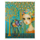 Un éléphant stylisé et coloré se tient à côté d'une fille aux grands yeux et d'un casquette fantaisiste à motifs. Des arbres pointillés et des rayures verticales vibrantes remplissent l'arrière - plan d'un sens de l'imaginaire et de l'émerveillement. Photoshop Art numérique CS5