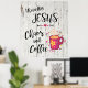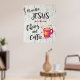Éclairez votre maison avec cette affiche chrétienne unique "One of a Kind" ! Il présente la citation chrétienne comique..."I Run On Jesus, Chaos and Coffee"... et une tasse de café rose avec du café chaud à la vapeur...Entouré de fleurs et de coeurs colorés! Art graphique original par l'artiste Kerry Miller.