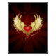 Coeur rouge vif d'un ange aux ailes dorées brillant dans l'arrière - plan rouge foncé et rayonnant décoré d'un motif.