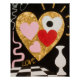 Un tableau abstrait, mixte, représentant un grand coeur doré texturé au centre, avec des rayons de lumière venant du haut à droite. À l'intérieur du coeur doré se trouvent trois petits coeurs en rose pastel, rouge vif et blanc, ce dernier contenant un point noir. Un vase blanc et stylisé se trouve sur un damier au coin inférieur droit, tandis qu'une ligne sinueuse et rosée serpente sur le côté gauche de la toile. Le mot "LOVE" est peint en lettres d'or près du bas à gauche. L'arrière - plan est un noir foncé. L'oeuvre a un style graphique audacieux et un fort sens du symbolisme, combinant des éléments d'amour, de chaos et d'ordre.