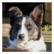 Un beau chien de ferme en collie à la frontière, pris caché derrière une remorque tracteur.