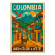 Affiche de voyage rétro vintage de la Colombie. Avant-plan : une scène de rue coloniale de Carthagène avec des maisons aux couleurs pastel vibrantes, des balcons débordant de fleurs tropicales, et des routes pavées.