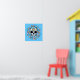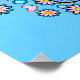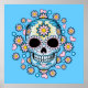 Le crâne à sucre aux teintes de bleu et de rose est entouré de fleurs et de coeurs colorés.
