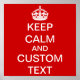 Créez votre propre affiche "Keep Calm and Carry On" en utilisant ce modèle simple et les instructions pratiques. Inspiré d'un slogan d'affiche britannique 2ÈME GUERRE MONDIALE antique, le design "Keep Calm" est très tendance et populaire. Utilisez le champ "Personnalisez-le" pour en faire votre propre. Même la couronne blanche peut être "changée" si vous avez votre propre graphique. Ajustez les champs de texte pour dire ce que vous voulez : votre passe-temps préféré, votre occupation ou un dicton drôle. Lorsque vous avez terminé, si vous avez besoin de faire plus de modifications ou de redimensionner et déplacer votre image ou votre texte pour l'adapter, cliquez sur "Customiser" et réorganiser comme vous le souhaitez. Disponible sur plus d'articles dans notre magasin.