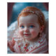 Un tableau numérique hyper détaillé et éthérée d'une petite fille d'une semaine avec un doux sourire. Elle a des cheveux cramoisi doux formant un halo délicat et une peau chérubic sans défaut avec un subtil rougissement rose. Ses yeux brillants bleu clair sont encadrés de fines cils de bébé, et un léger rougissement de parties scintillant dorée scintille sur ses joues. Elle porte de minuscules ornements exquis : un coronet miniature ou un bandeau de fils d'or ou d'argent avec de minuscules pierres et perles rouges, de petites boucles d'oreilles en stud, et un délicat collier en dentelle orné de petites billes et broderies rouges. Nichée dans de luxueux tissus crème et rose pâle, elle s'assied contre un arrière - plan de bokeh doux et rêveur dans des bleus cool, blancs et rouges subtils. Un éclairage directionnel magique et doux met en évidence la lueur de sa peau, la vitalité de ses cheveux, et les ornements complexes, évoquant l'innocence, la fantaisie et la beauté précieuse.