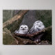 Cute snowy owls sitting among trees and stones, watercolor effect.