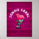 Une affiche avec une jolie illustration de fille zombie avec cheveux roses chauds et peau verte mort. Portant une tenue à thème punk rock. Ses bras s'étendirent à la recherche de cerveaux. Texte courbe : Zombie Grrrl. Placez-vous sur un arrière - plan qui est une couleur magenta profonde avec un look grunge.