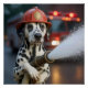 A dalmatian dog confidently holds a water-spraying fire hose, standing in front of a red fire truck.