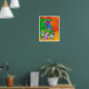 Bienvenue au Paradis ! Ajoutez de la couleur et du plaisir à tout décor en ajoutant une touche des tropiques avec cette Annika Tropical Bird Poster. Annika Tropical Bird est une illustration originale créative créée par Debi Payne Designs. L'Annika Bird fictif et coloré est créé avec le corps bleu et accentué par un arc-en-ciel de couleurs tropicales vives et vives pour les plumes. La tête de l'Annika Bird est ornée d'un peigne fantaisiste de tourbillons roses chauds. L'oiseau est perché sur une branche d'arbre et entouré de fleurs délicates aux couleurs tropicales pastel sur un arrière - plan de feuilles vert vif.