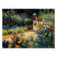"In the Garden" est une représentation vibrante de la vie en plein air. La scène dépeint un jardin luxuriant rempli de fleurs, où un seul personnage profite tranquillement de l'environnement serein. La figure centrale, souvent considérée comme la femme de Monet, Camille, porte un panier de fleurs entouré d'une profusion de fleurs colorées. Le tableau se caractérise par son riche usage de couleurs, de lumière applaudie et l'interaction délicate de l'ombre et de la lumière du soleil, qui crée un sentiment de chaleur et de tranquillité. La brosse lâche et l'attention portée aux effets de la lumière sur les éléments naturels reflètent un style impressionniste, mettant l'accent sur la beauté des moments quotidiens passés dans la nature. Cette oeuvre saisit l'essence d'un après-midi paisible et ensoleillé dans un jardin, où le dynamisme des fleurs et l'atmosphère douce se combinent pour créer une scène intemporelle de détente et de contentement.