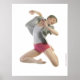 Danseur portant veste grise, saut, contre arrière - plan blanc