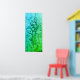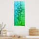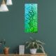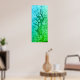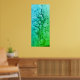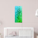 Cette oeuvre est une oeuvre abstraite verticale avec un dégradé de bleus et de verts. Les couleurs passent doucement d'un bleu profond et apaisant en haut à un vert vif en bas. Une ligne blanche distinctive descend directement au centre de la pièce, ajoutant un sens de profondeur et de division. La texture de surface est riche, avec des formes circulaires et organiques dispersées dans tout le pays, donnant un sentiment de fluidité et de mouvement. L'ensemble est serein et évoque des scènes sous-marines ou des textures naturelles.
