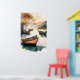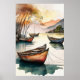 Affiche de bateaux à rames sereins flottant sur un lac calme entouré de montagnes et d'arbres, avec un ciel chaud et doré illuminant la scène. Les eaux paisibles reflètent les bateaux et les couleurs douces du coucher du soleil.