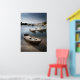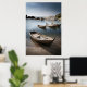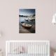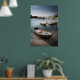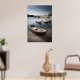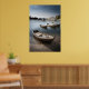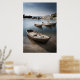 Poster de quatre barques en bois flottant près du rivage d'un plan d'eau calme sous un ciel légèrement couvert. De gros rochers et quelques petites structures sont visibles dans l'arrière - plan.