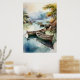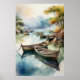 Poster de barques flottant doucement dans un plan d'eau serein et turquoise entouré de rivages rocheux et de feuillage luxuriant. La lumière douce et diffuse crée une atmosphère de tranquillité et de beauté naturelle.