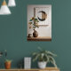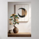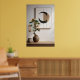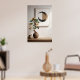 Poster d'une scène intérieure minimaliste avec un vase décoratif en céramique tenant un petit plante de style élégant aux feuilles multicolores, posé contre un mur orné d'art graphique aux formes croisées. La lumière naturelle douce met en valeur l'atmosphère sereine et moderne, mettant en valeur le mélange harmonieux de l'art et de la nature.