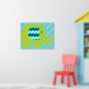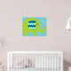 Un poster de pépinière coloré présente un éléphant vert citron avec des oreilles rayées turquoises, blanches et navales, et un arrière - plan avec des rayures en diagonale turquoises bleues et blanches.