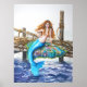 Avec ses magnifiques serrures rouges et sa queue turquoise, une sirène s'installe sur un ponton en bois au bord de la mer. Elle a d'abord choisi une jolie couverture pour s'asseoir, puis attend que quelqu'un s'arrête et profite de la brise avec elle. Affiche.